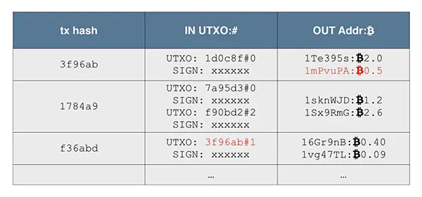 比特币实际的交易记录是由一系列交易构成,每一个交易都包含一个或多个输入,以及一个或多个输出。未花费的输出被称为UTXO(Unspent Transaction Ouptut)。