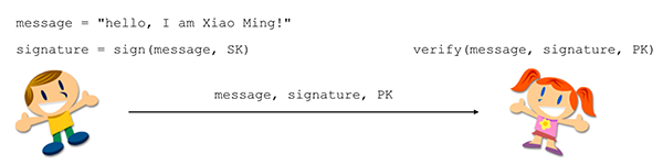 当私钥持有人,例如,小明希望对某个消息签名的时候,他可以用自己的私钥对消息进行签名,然后,把消息、签名和自己的公钥发送出去: