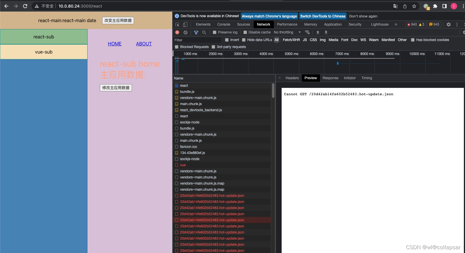 使用qiankun实现位前端,主应用和子应用1均使用create-react-app创建,子应用2使用vue-cli创建。在本地进行连调时,发现主应用链接子应用1时(react),如果主应用有修改,进行保存后,就会不断请求http://localhost:3001/20d42ab14fe602b52483.hot-update.json,请求结果为404,如下图: