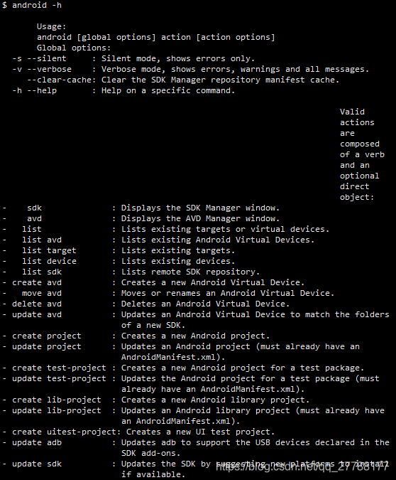 检查 sdk 安装成功,android -h