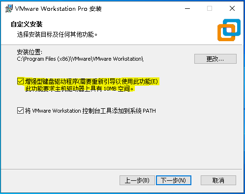 为了能测试驱动程序运行状态,读者需安装VMWare虚拟机,双击附件中的VMware-workstation-full-16.2.4-20089737.exe安装程序一直点击下一步即可,需要注意的是在如下选项中请在增强型键盘驱动程序上打对勾,之后等待安装完毕即可;