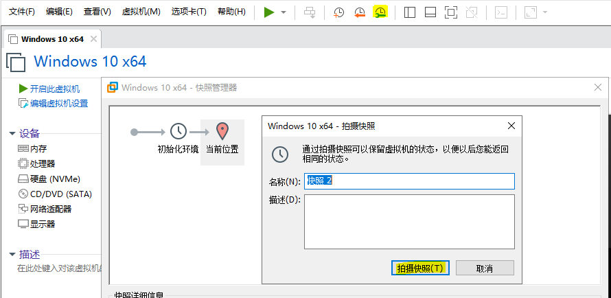 当这些都做好以后,建议用户关闭虚拟机,并点击虚拟机菜单,找到快照并拍摄一个快照,快照的作用是当虚拟机系统出现问题后可快速恢复到初始模式,避免重装系统,在后续课程中读者会出现无数次的蓝屏,而虚拟机快照的快速恢复功能则是一个很好的选择;