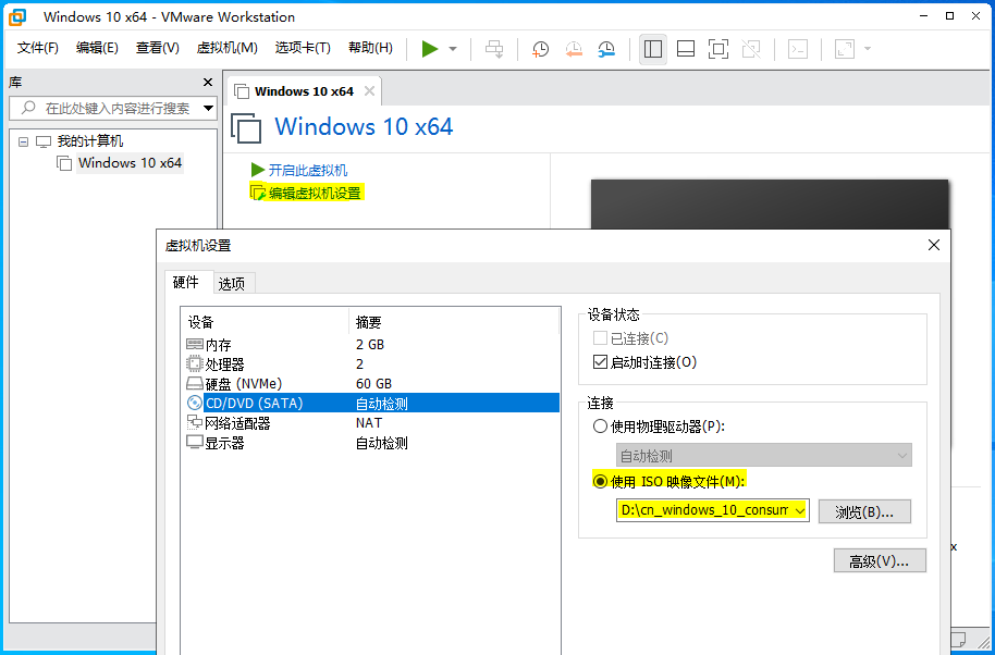 虚拟机模板创建完成后,读者可根据如下配置选择编辑虚拟机设置,并在磁盘位置处将课件中的cn_windows_10_consumer_editions_version_1903_x64_dvd_8f05241d.iso挂载到虚拟机上;