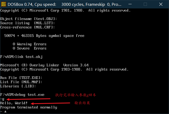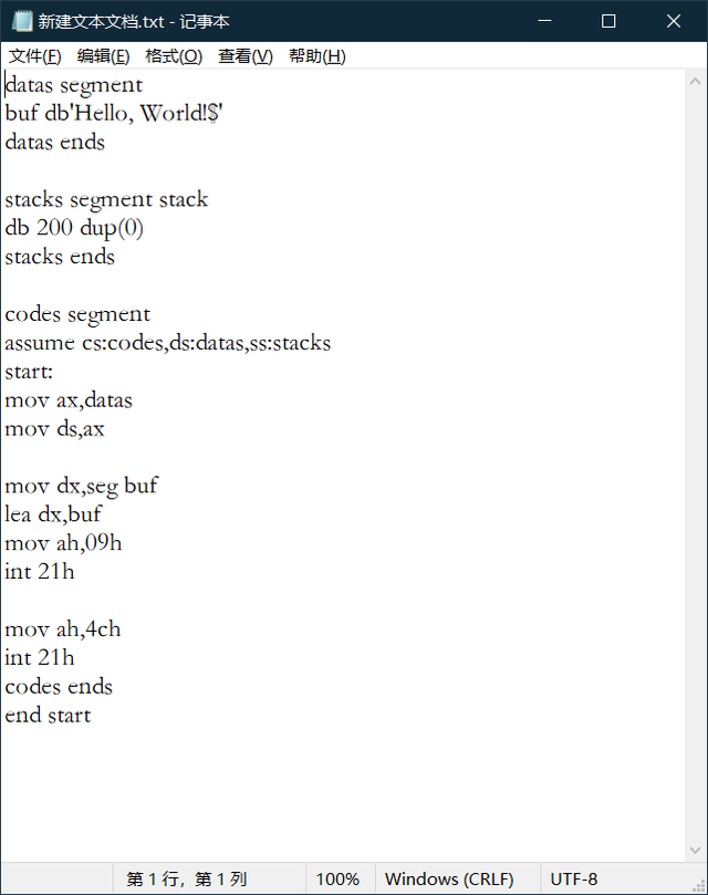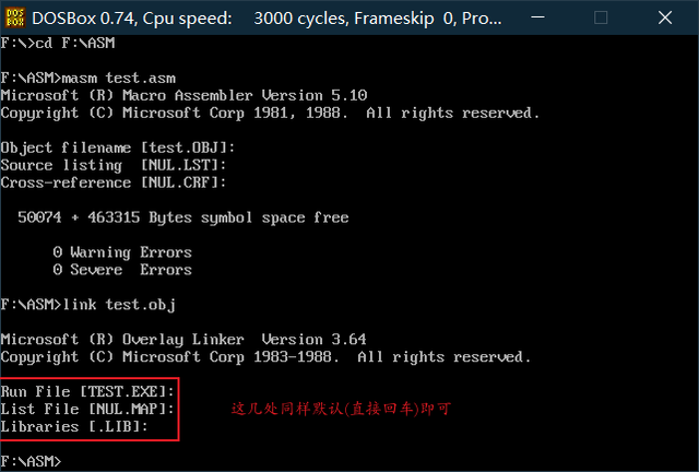 打开DOSBox使用下面命令创建并编辑test.asm文件