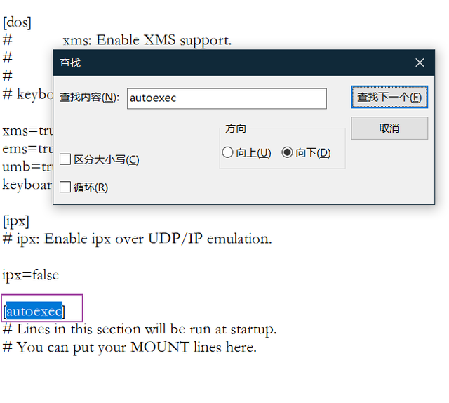 使用快捷键Ctrl+F查找其中的[autoexec]部分(一般在文件末尾)