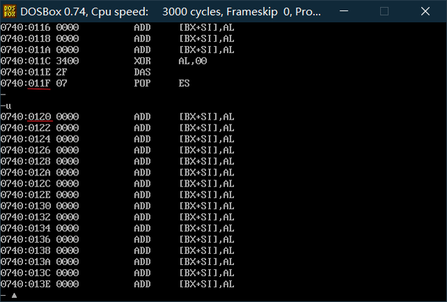 用U命令查看从1000:0开始的内存单元中的机器指令和他们所对应的汇编指令