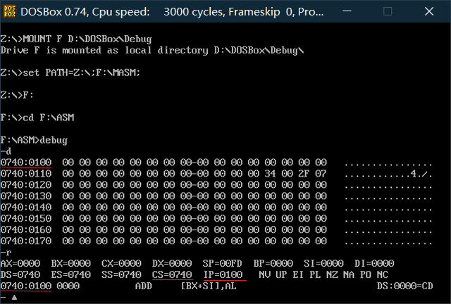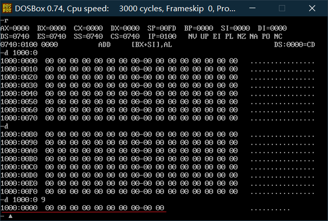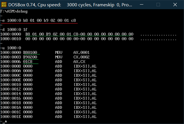 用E命令向从1000:0开始的内存单元中写入了8个字节的机器码