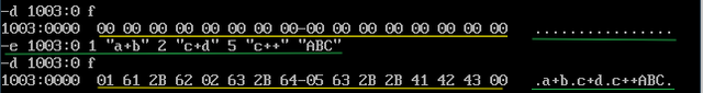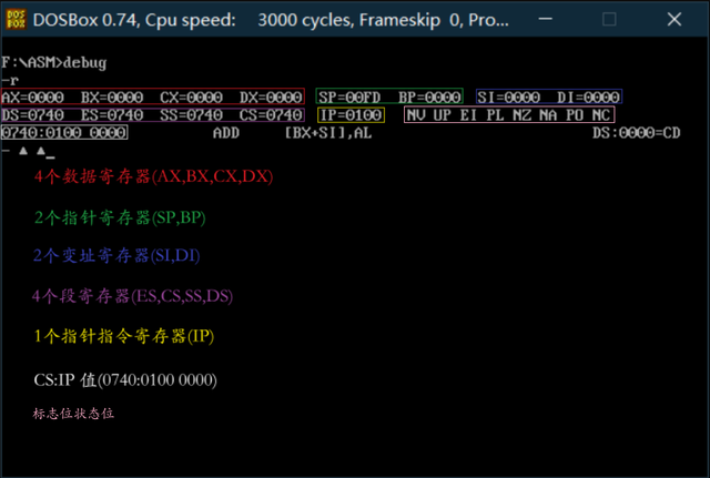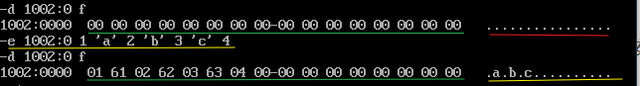 右边是每个内存单元中的数据对应的可显示的ASCII码字符.若没有对应可显示的ASCII字符,debug就用"."来代替