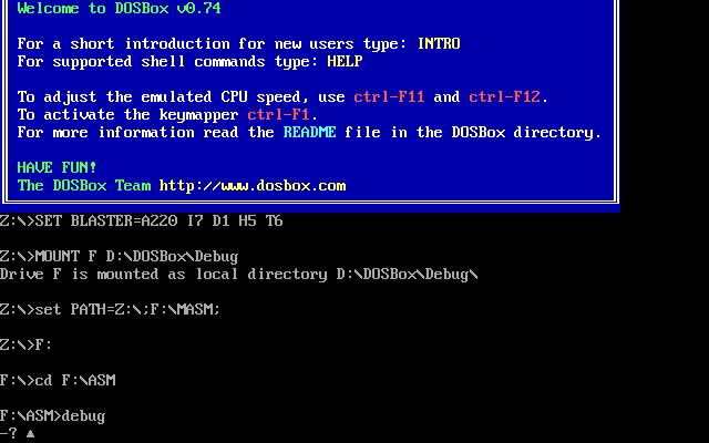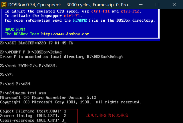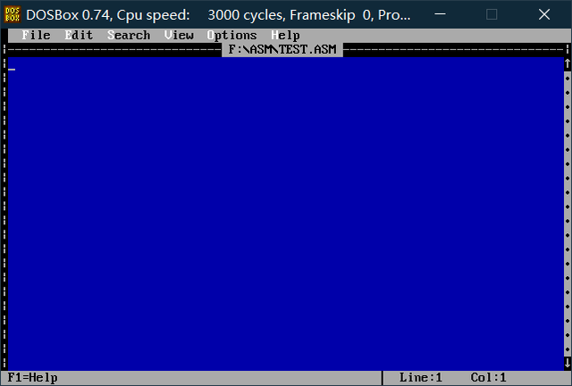 关于创建并编辑文件,如果你的工作目录(挂载的目录)有EDIT.COM文件(我提供的汇编工具包中有),那么你就可以在DOSBox中创建并编辑文件,如果没有请使用我提供的工具包或者耐心往下看.