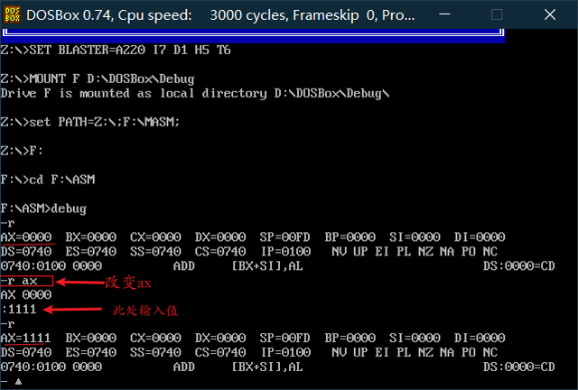 用E命令以提问的方式来逐个地修改从某一地址开始的内存单元中的内容