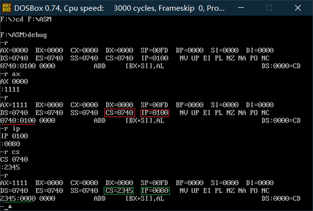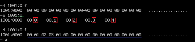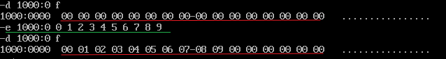 红色部分为用户输入的修改的数据,到了某一内存单元的时候,可以选择修改(输入要修改的数值),也可以选择不修改(直接按空格),处理完一个内存单元之后,按空格,继续处理下一个内存单元;全部都处理完毕之后,按enter