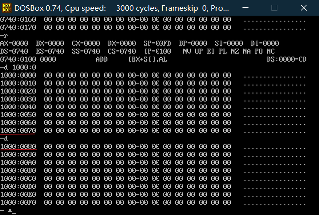 使用d 段地址:偏移地址查看(以d 1000:0为例)