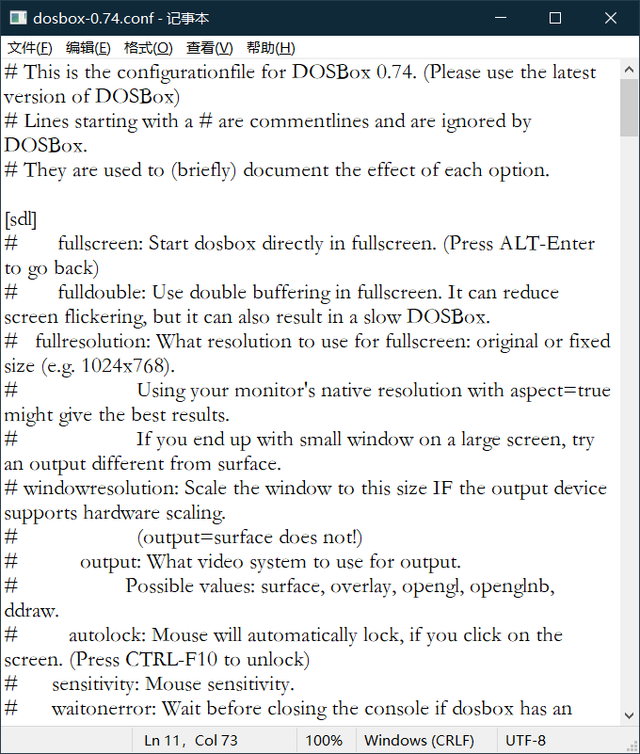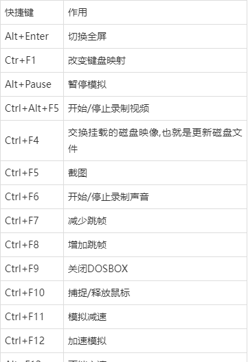 注意:以上快捷键我并没有全部测试,更多详细信息参见README.txt(在DOSBox安装目录中的Documentation里面)