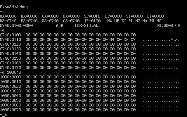 用D命令查看内存1000:0~1000:1f中的数据(从数据的角度看一下写入的内容)