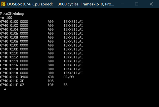 该命令从指定地址开始,反汇编32个字节,若地址省略,则从上一个U命令的最后一个指令的下一个单元开始显示32个字节