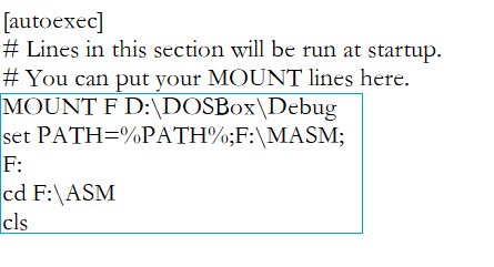 注意:不进行此种配置的话,每次打开DOSBox是需要手动输入上述命令,非常麻烦