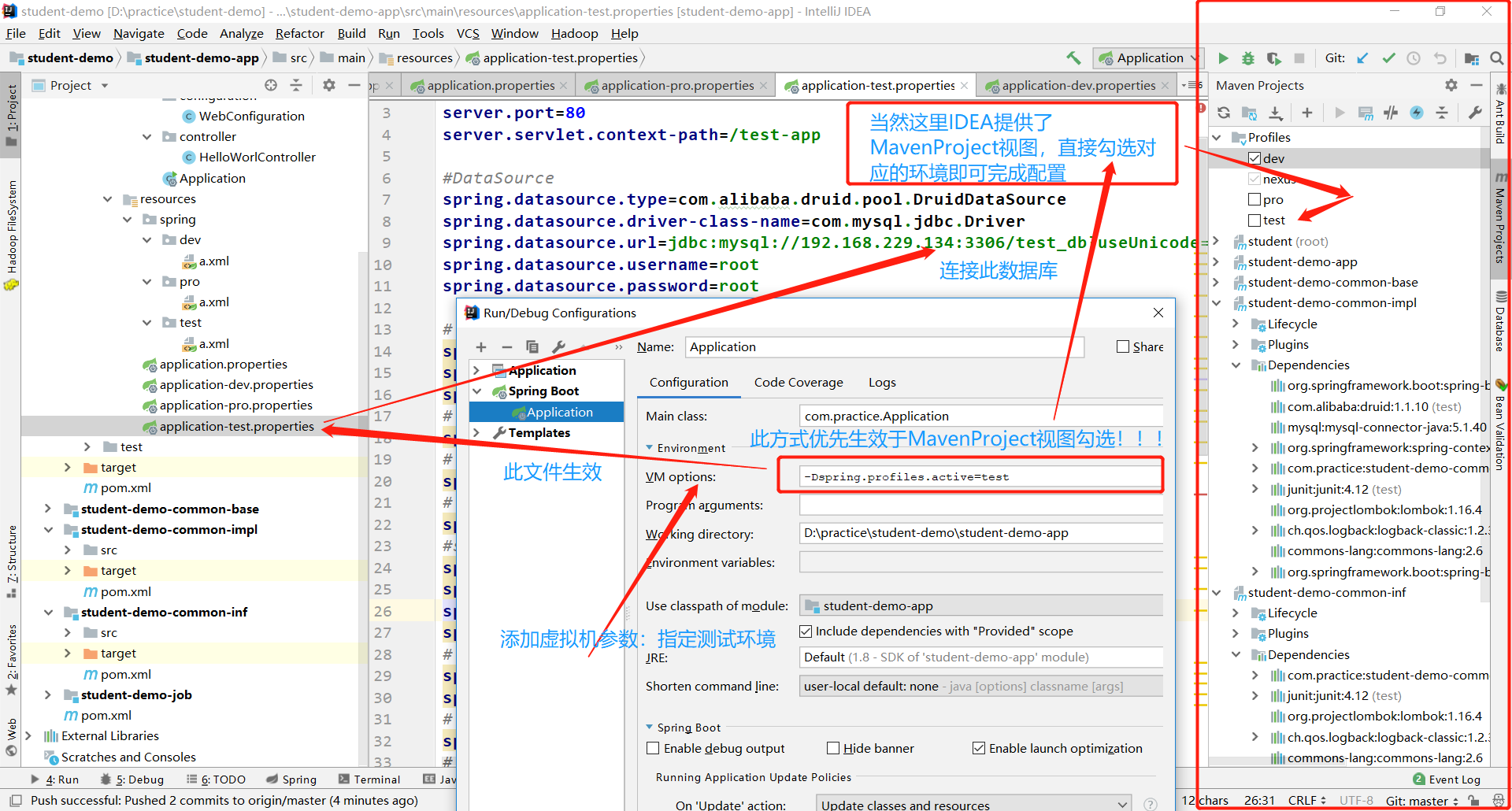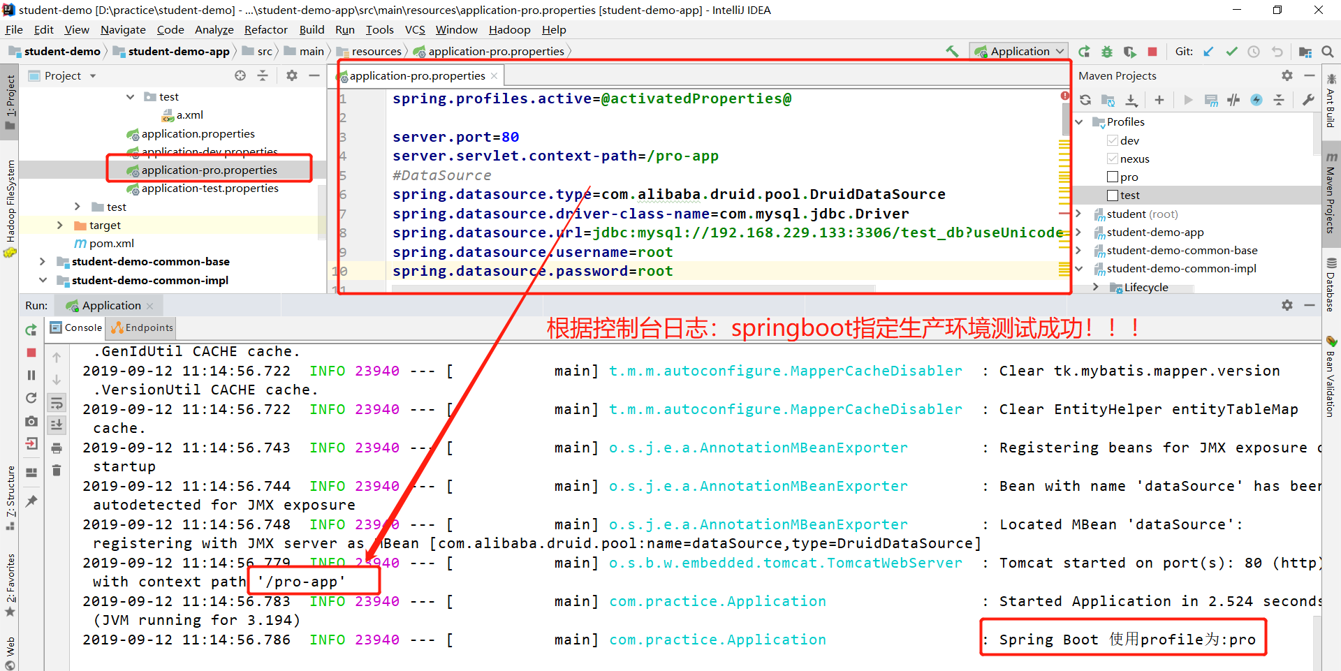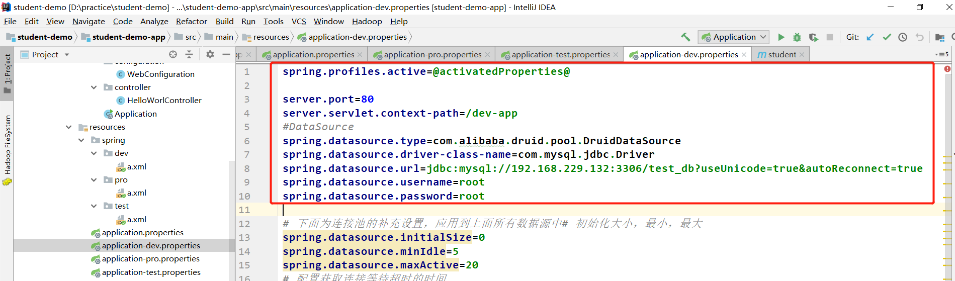 在本次演示中,使用IDEA结合maven的profile来实现对数据库的切换以及应用端口的切换。工程结构如图: