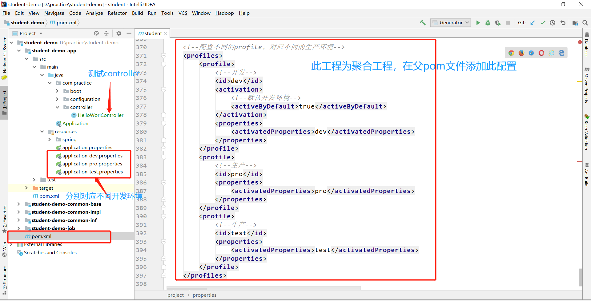 在开发过程中,我们的项目会存在不同的开发环境,比如开发环境、生产环境、测试环境,而我们的项目在不同的环境中有些配置也是不一样的,比如数据源配置、日志文件配置等,假如我们每次将软件部署到不同的环境时,都需要对相应的配置文件进行修改,来来回回修改,很容易出现少改的地方,而且浪费我们的劳动力。项目用的maven的profile来区别不同的环境配置,我也正好来学习一下。