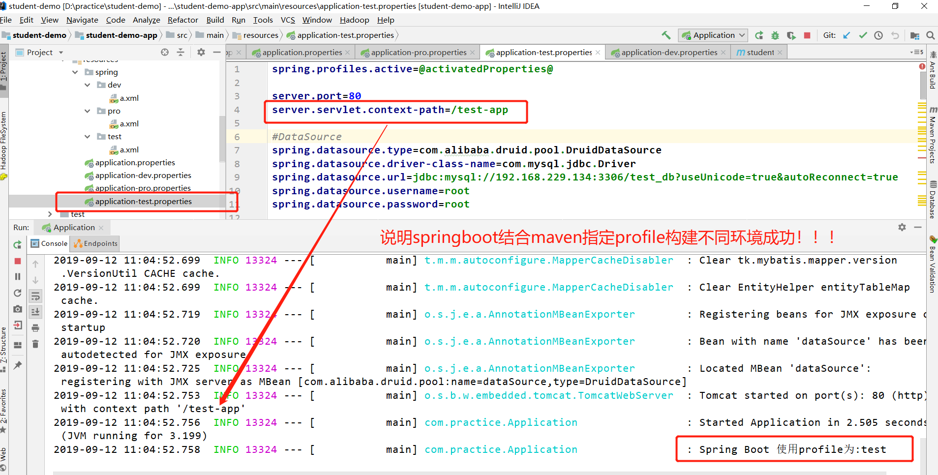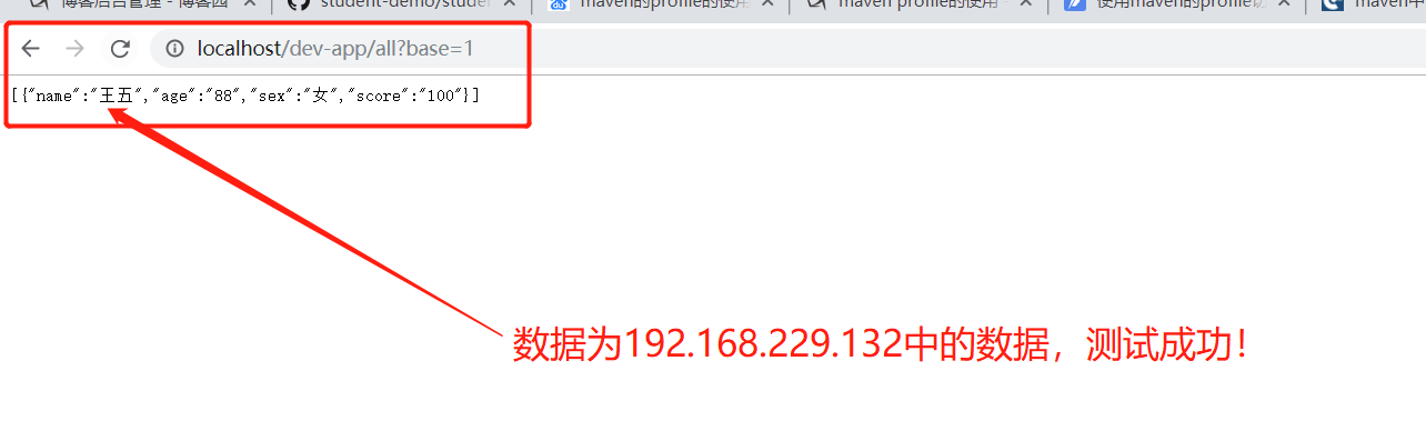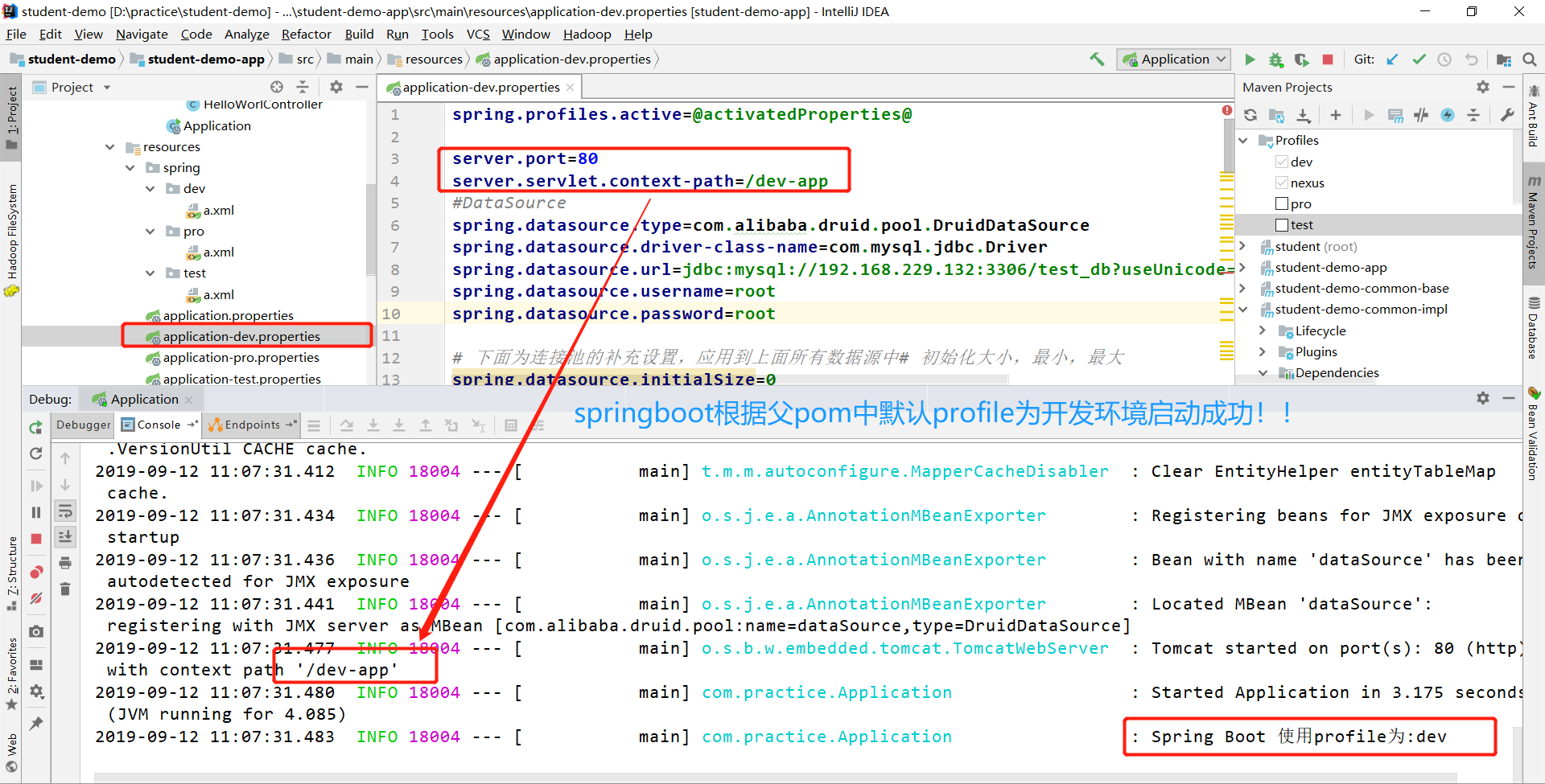①默认情况:父pom中已指定默认情况为开发环境,连接192.168.229.132数据,学生名应该为王五,上下文根为/dev-app,启动springboot测试如下: