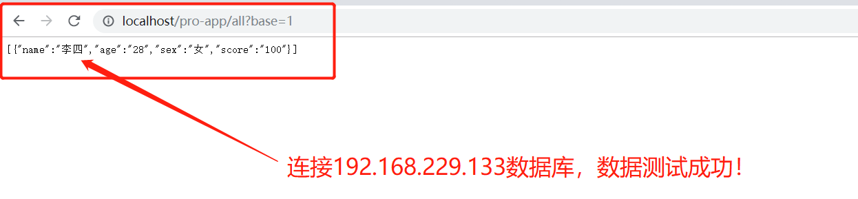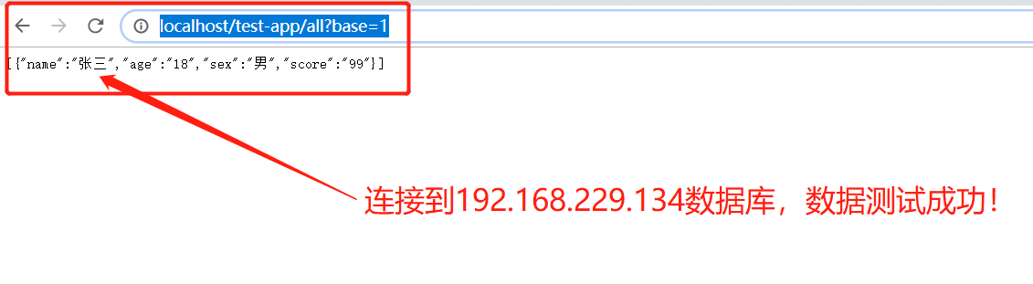 打开浏览器访问:http://localhost/test-app/all?base=1,连接192.168.229.134数据,学生名应该为张三