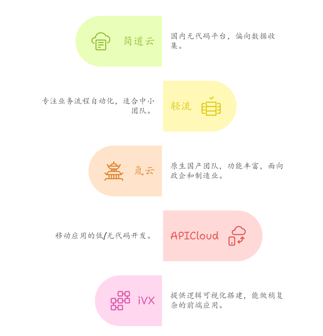 - APICloud(被爱创科技并购):主打移动应用的低/无代码开发;