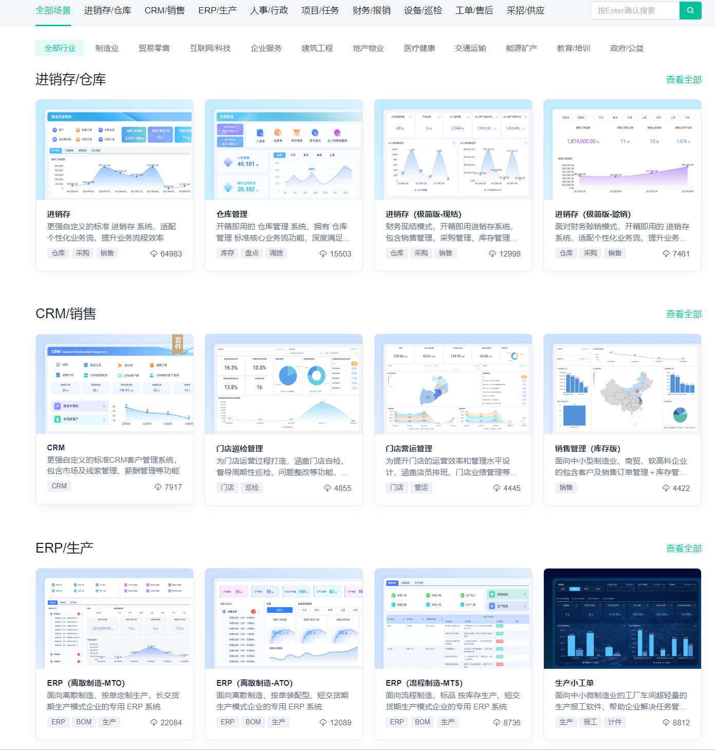 中国企业特别喜欢“因地制宜”,不管做ERP、做OA,最后都要高度定制。国产无代码平台抓住了这个点,一上来就做了很多行业场景模板,比如: