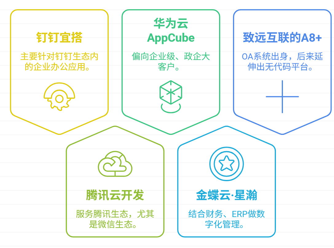 - 钉钉宜搭(阿里系):主要针对钉钉生态内的企业办公应用;