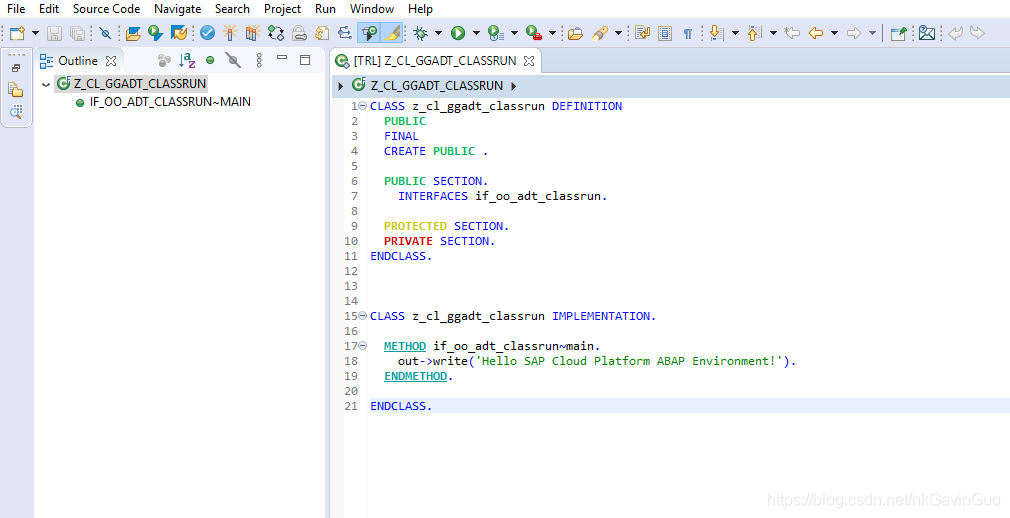下图展示了在Cloud上通过ABAP控制台输出“Hello SAP Cloud Platform ABAP Environment”这一操作。可以看到,在Cloud上对于控制台的调用是通过实现IF_OO_ADT_CLASSRUN这一接口实现的。而对于字符串的输出是在MAIN方法来实现的,这是不同于传统ABAP中使用SE38的report和经典的START-OF-SELECTION事件。在Cloud环境中已经不再支持报表程序的创建和运行。