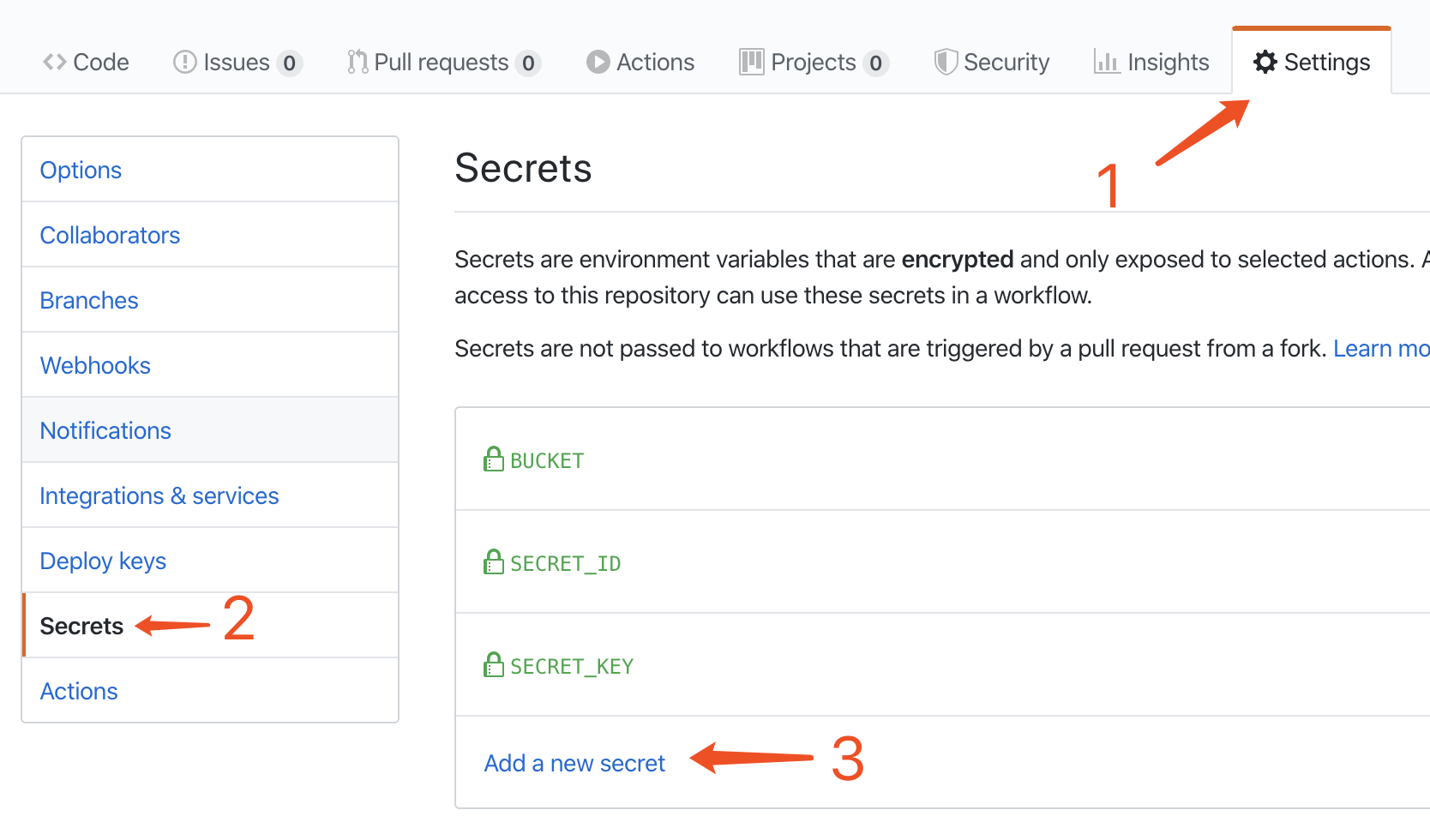 另外有没有注意到 ${{ secrets.XXX }} 这种参数,并不是具体的值,而是调用了 GitHub Settings 里保存的 secrets,添加方式如下: