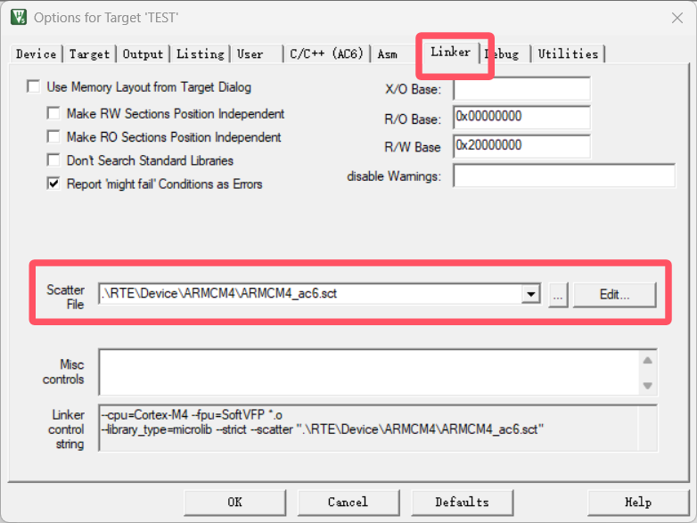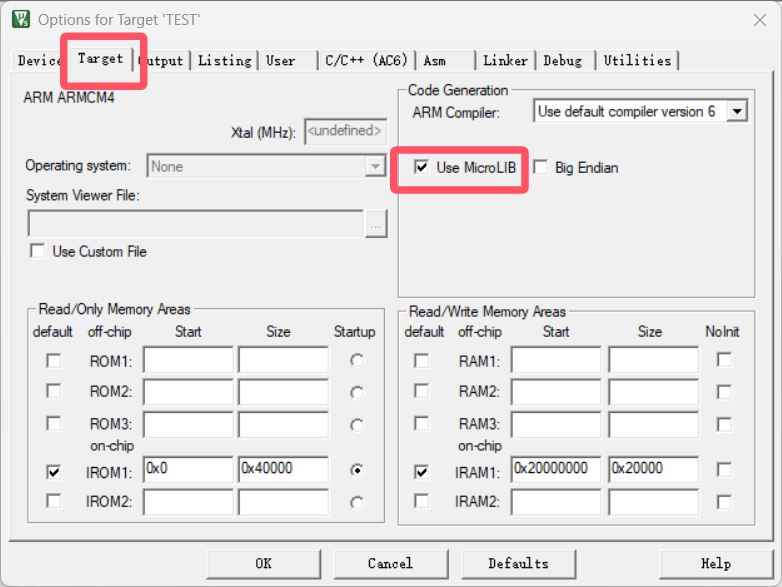 运行程序如果发生报错:Error: L6218E: Undefined symbol ImageZI$$Limit (referred from startup_armcm4.o).需要进行以下设置:如下图所示,在Taget页面,勾选“Use MicroLIB”;在Linker页面,将“Scatter File”设置为“.\RTE\Device\ARMCM4\ARMCM4_ac6.sct”,点击“OK”,错误分析请看:Keil5报错:Error: L6218E: Undefined symbol Image$$ARM_LIB_STACK$$ZI$$Limit_keil5 l6218e-CSDN博客