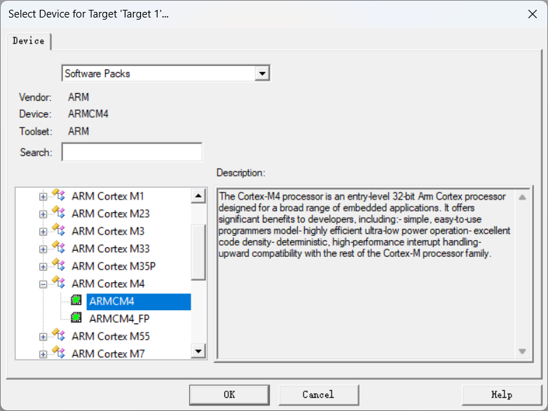 (2)选择好存放工程的文件夹,输入文件名后,在弹出的界面中的“ARM”加载菜单中选择“ARM Cortex M4”下的“ARMCM4”,如下图所示,点击“OK”。