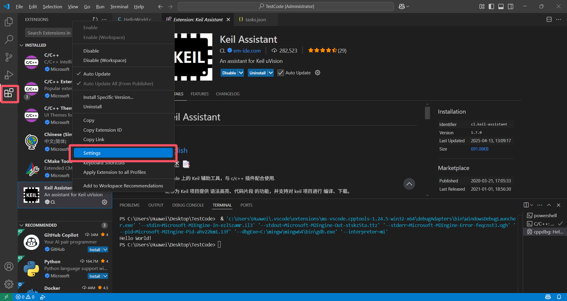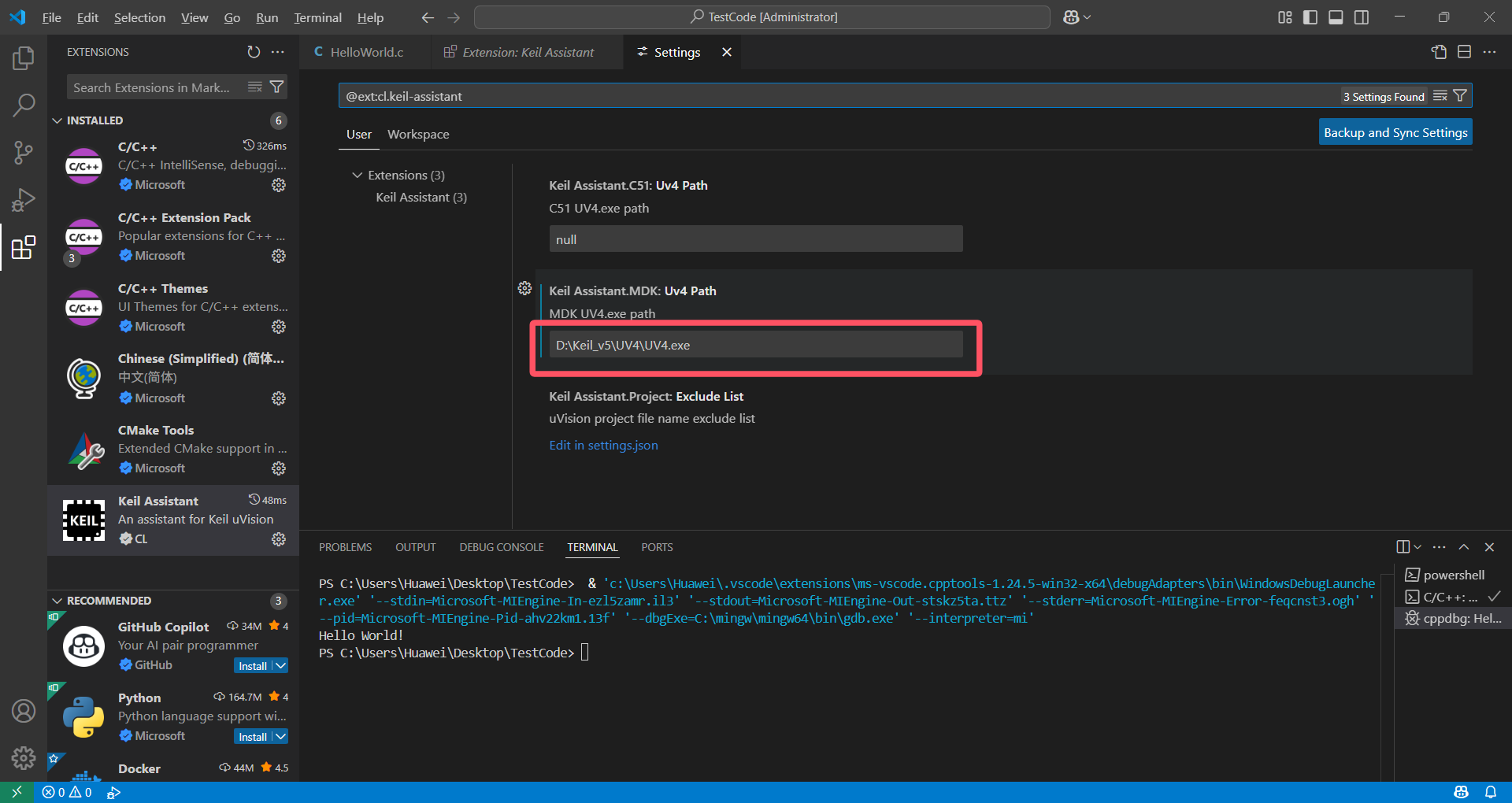 “以管理员身份运行”VS Code,将路径粘贴到安装好的“Keil Assistant”的“Settings”下,如下图所示