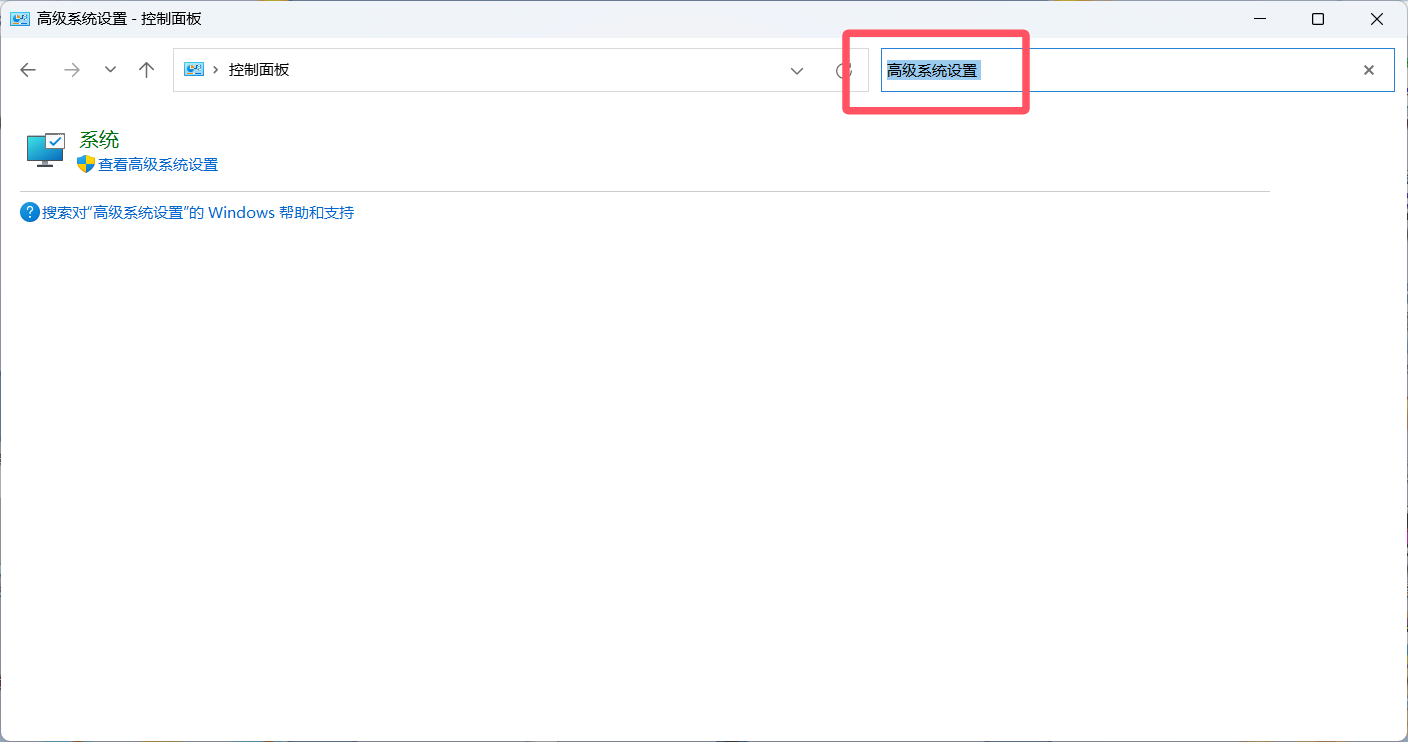 (1)打开控制面板,如下图所示,输入高级系统设置,