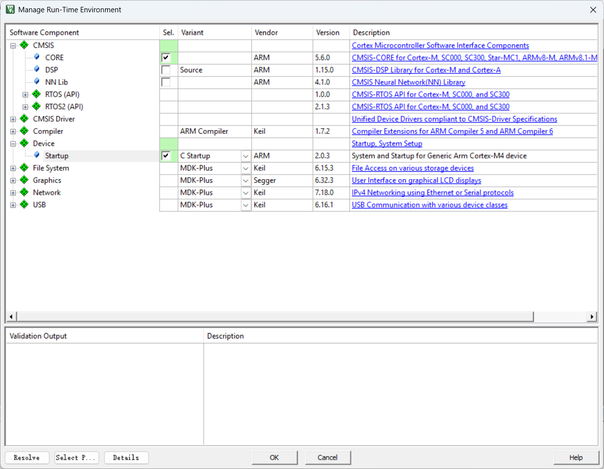 (3)在弹出的界面中勾选配置环境,在“CMSIS”中勾选“CORE”,在“Device”中勾选“Startup”,如下图所示,之后点击OK。