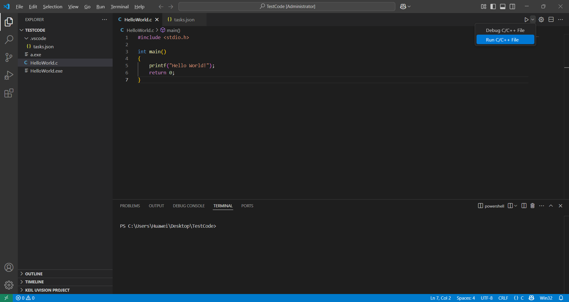 “以管理员身份运行”VS Code后,点击“Run C/C++ File”,如下图所示。
