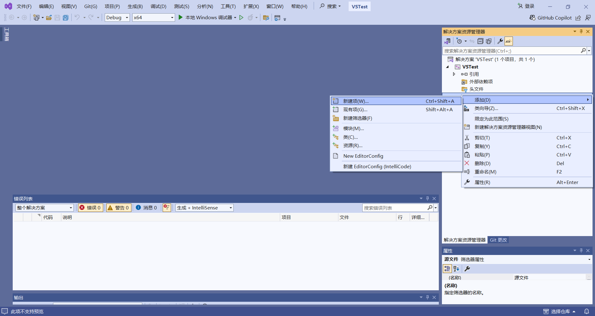 (4)点击“确定”,在弹出的主窗口中,右键点击“源文件”,点击“添加——新建项”,如下图所示。