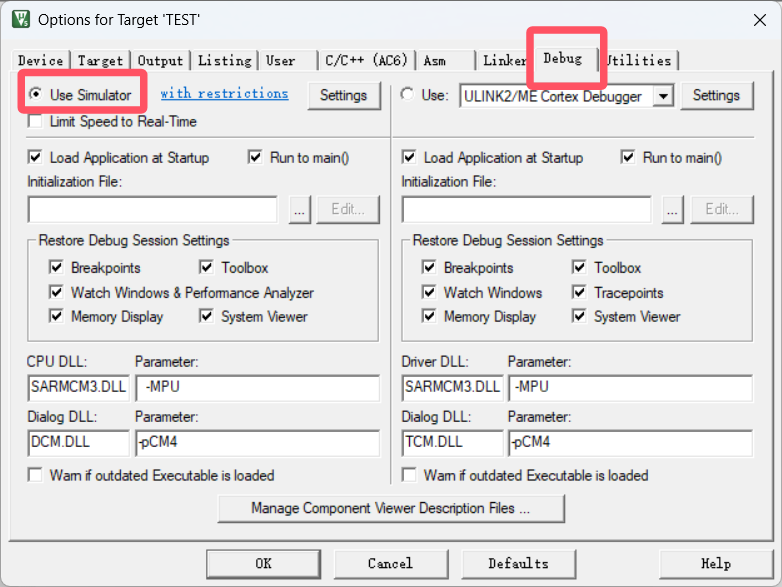 (7)点击“魔法棒”,需要设置的内容如下图所示,在C/C++页面中的“Language C”中选择“C99”;在Debug页面勾选“Use Simulator”;