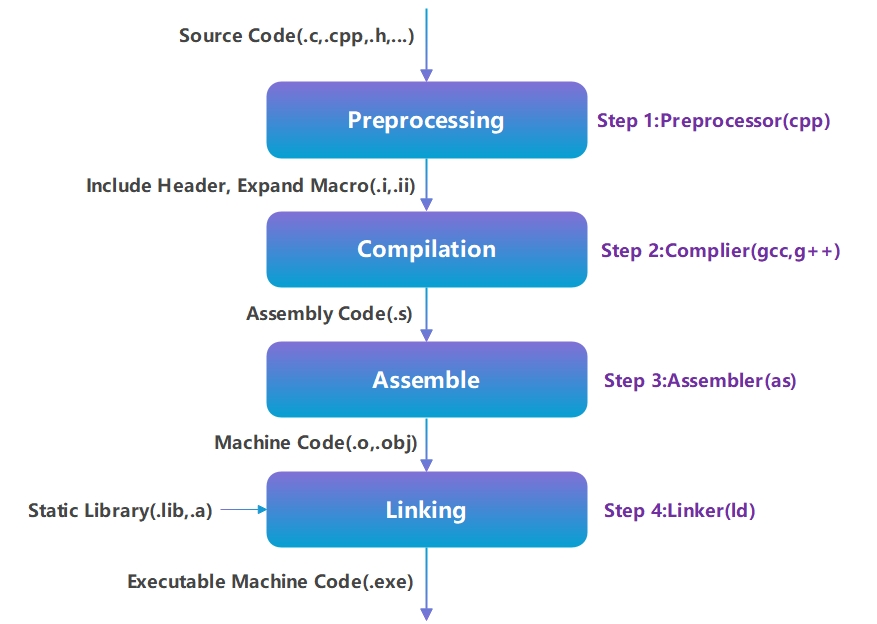 1、预处理(Processing);2、编译(Compilation);3、汇编(Assemble);4、链接(Linking)
