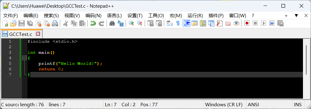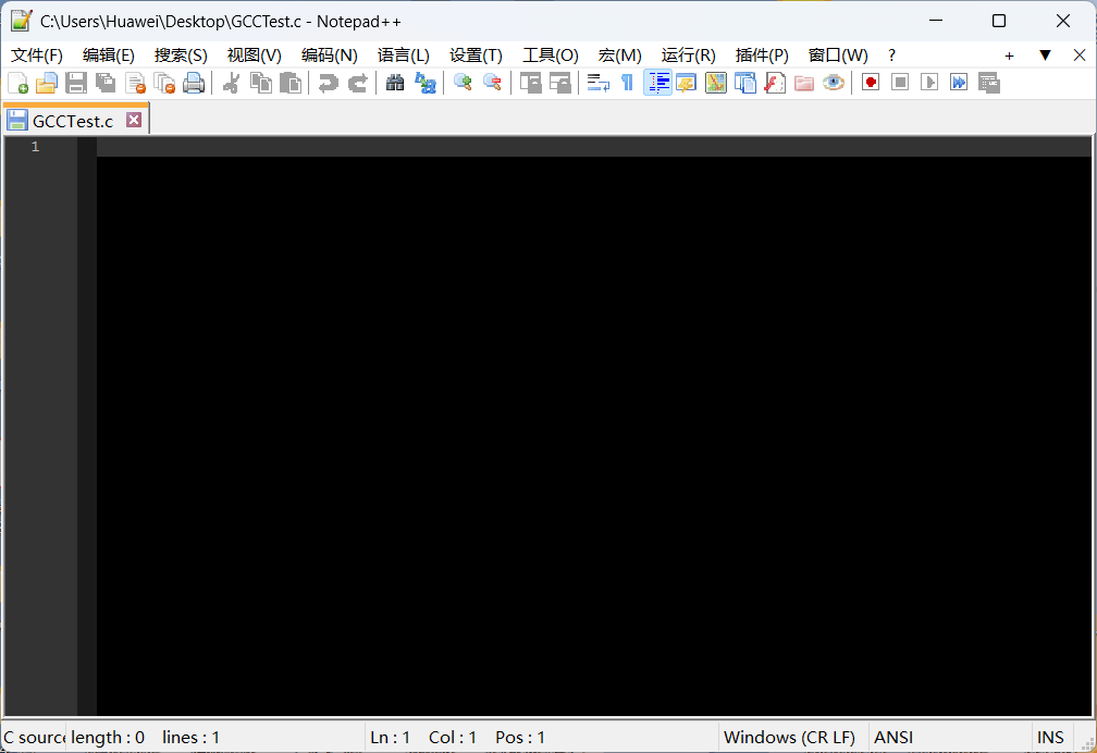 (7)在桌面上新建一个文本文档,并命名为“GCCTest.c”(更改后缀名.c),双击打开Notepad++,将改文件拖入,如下图所示。