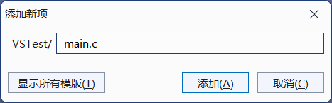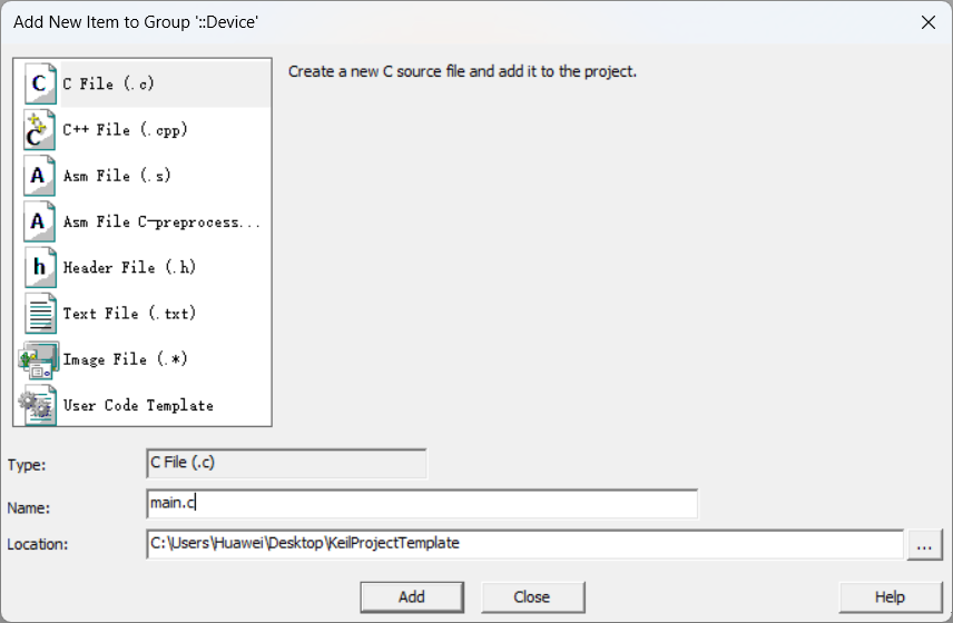 (6)在弹出的界面中点击“C File(.c)”,在“Name:”输入文件名,此处设置为“main.c”,如下图所示,点击“Add”。