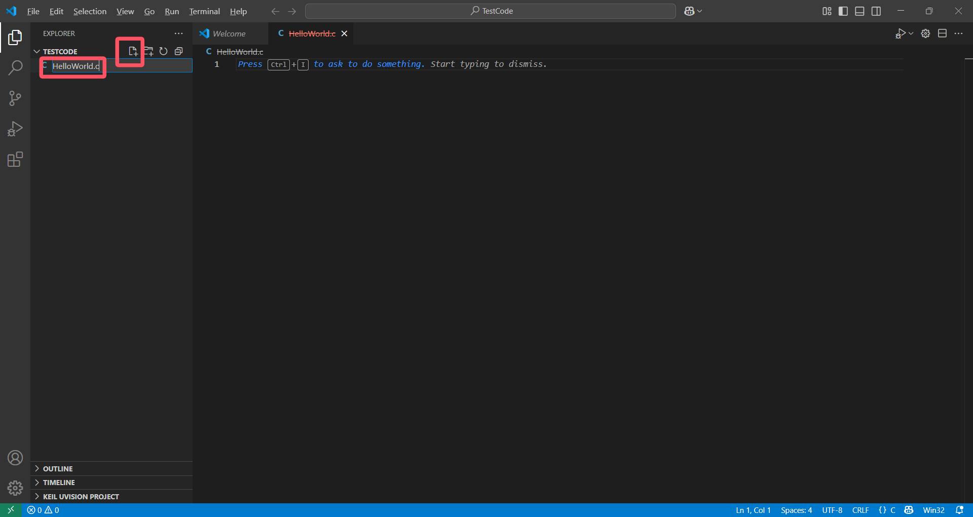 测试是否可以运行C程序,在桌面新建文件夹“TestCode”,右键选择“用VS Code”打开(如果没有可以直接将文件夹拖至VS Code图标处),新建文件并命名为“HelloWorld.c”,如下图所示。