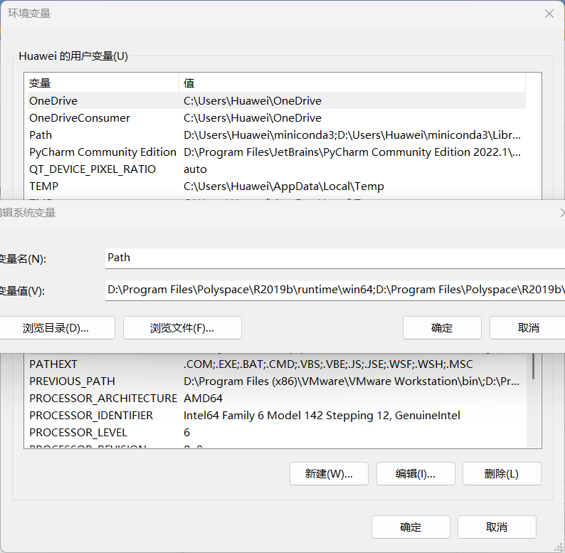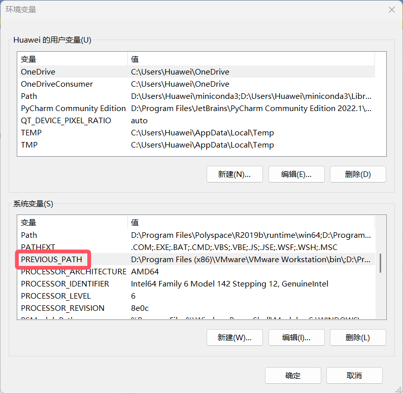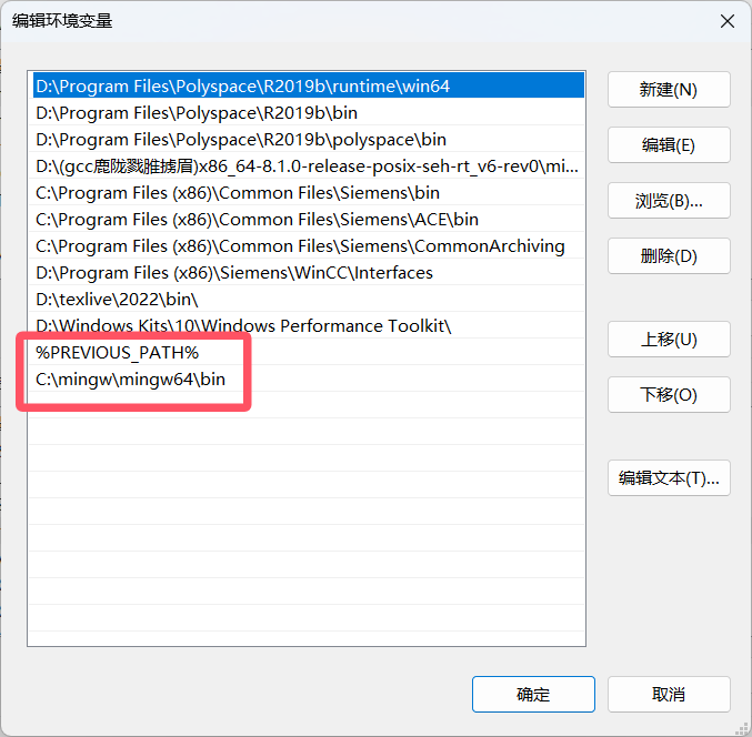 (6)再次双击“系统变量”中的“Path”,进入后在空白行双击,输入“%PREVIOUS_PATH%”(与自己新建的变量名匹配上),之后再进行(3)操作,点击“确定”即可完成配置,如下图所示,。