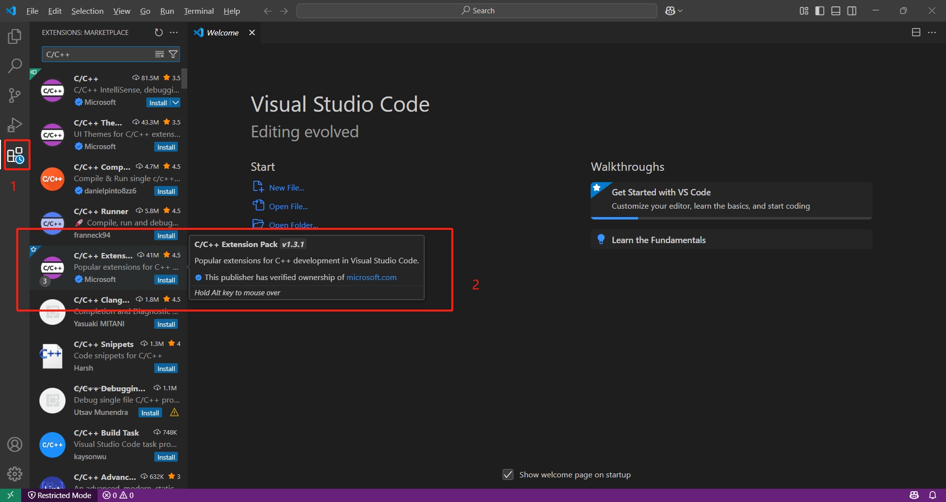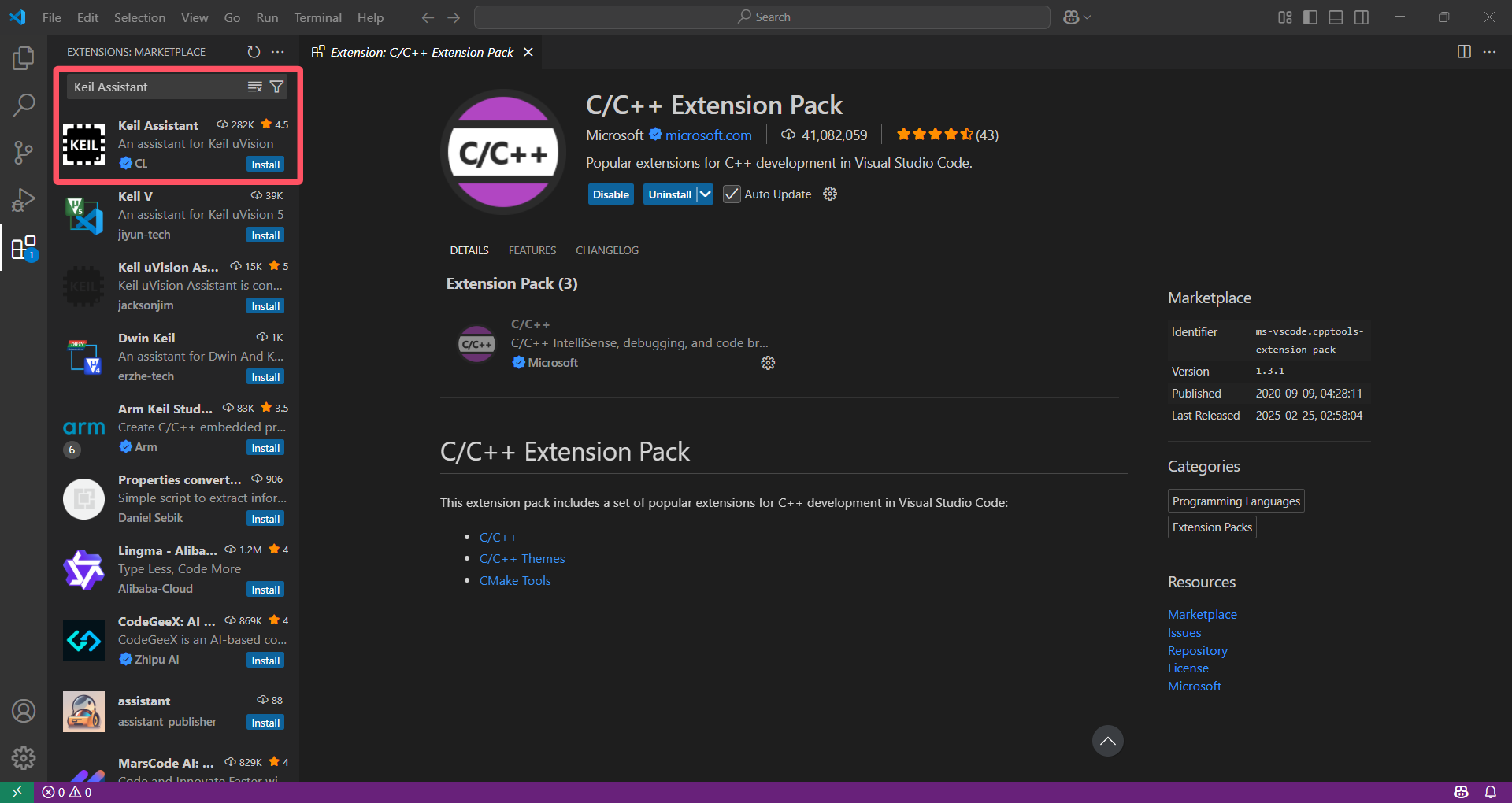 (1)打开下载好的VS Code,如下图所示,下载“C/C++ Extension Pack”插件和“Keil Assistant”插件,点击“Install”