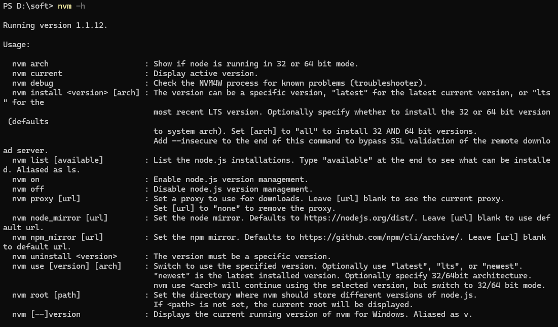 nvm 的使用在上面已经介绍差不多了,无非就是下载 nodejs, 切换 nodejs, 对于更详细的文档,大家直接执行 nvm -h 即可查看。