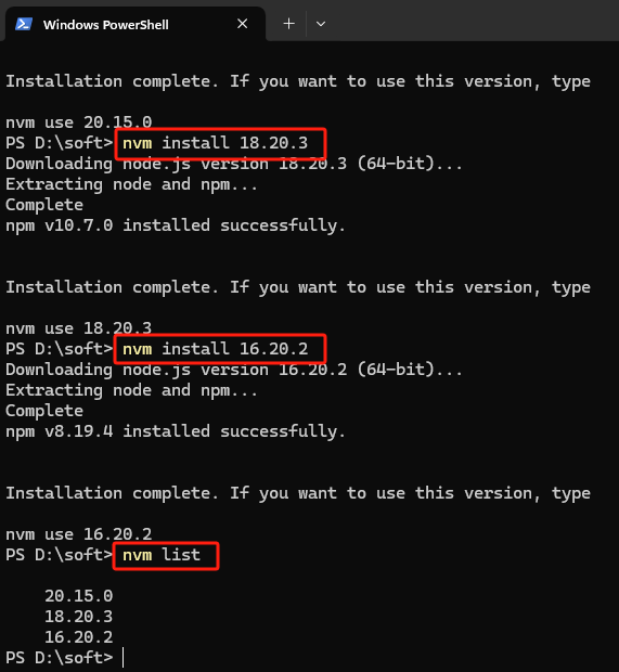 注:如果你在下载或切换 nodejs 时提示没有权限,请使用管理员权限打开 PowerShell.