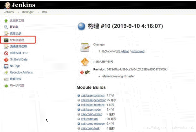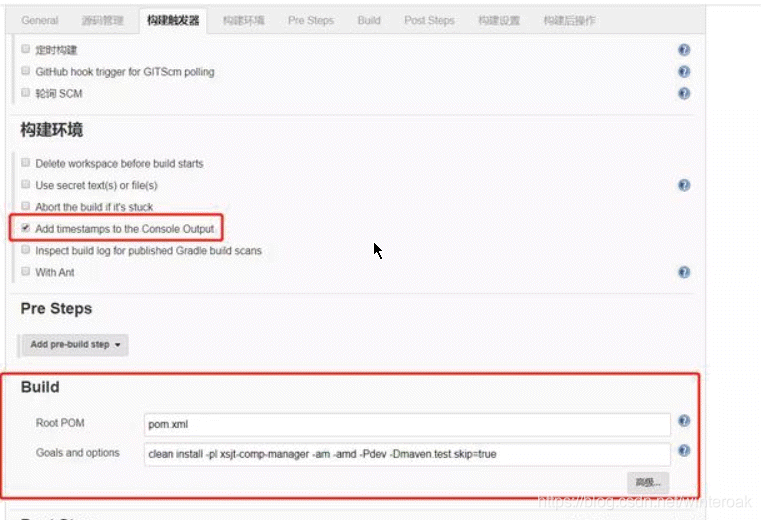 构建环境中勾选“Add timestamps to the Console Output”,代码构建的过程中会将日志打印出来