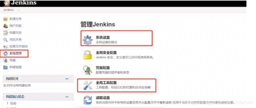 进入系统管理,可以配置:系统设置、全局工具配置、插件管理