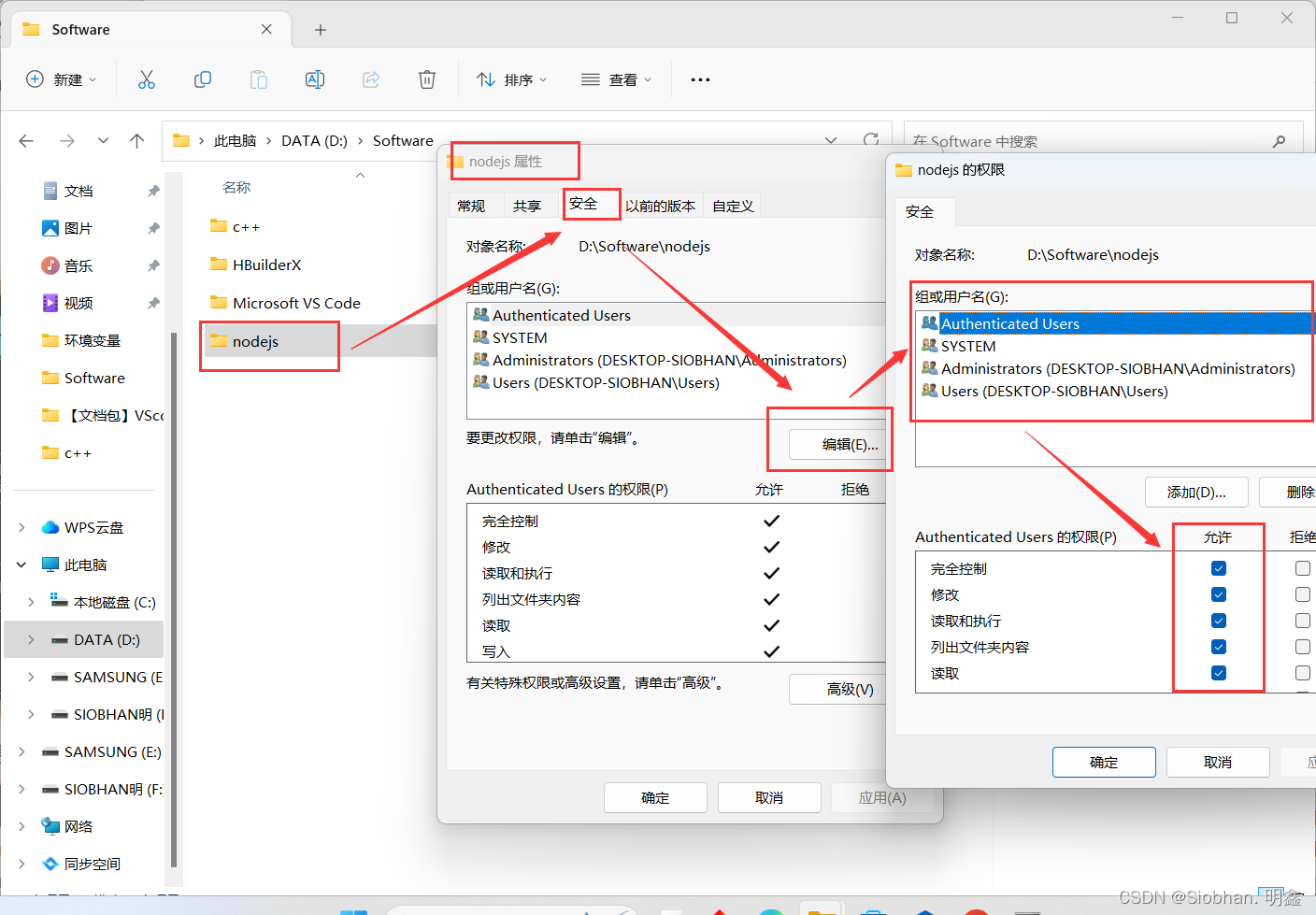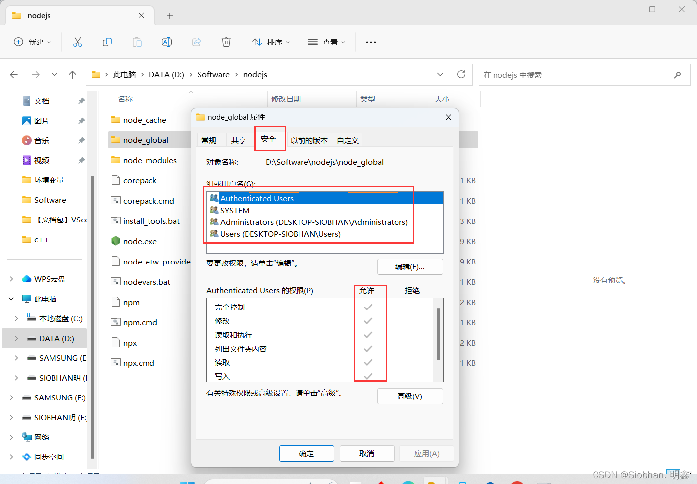 更直接的方式就是将【nodejs】文件夹的权限进行修改: