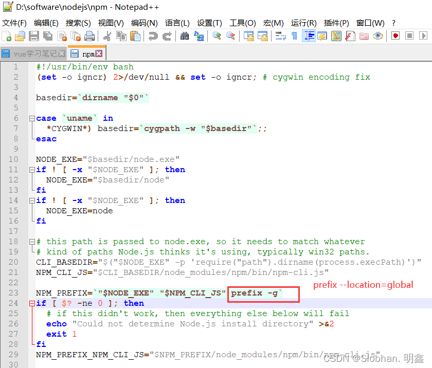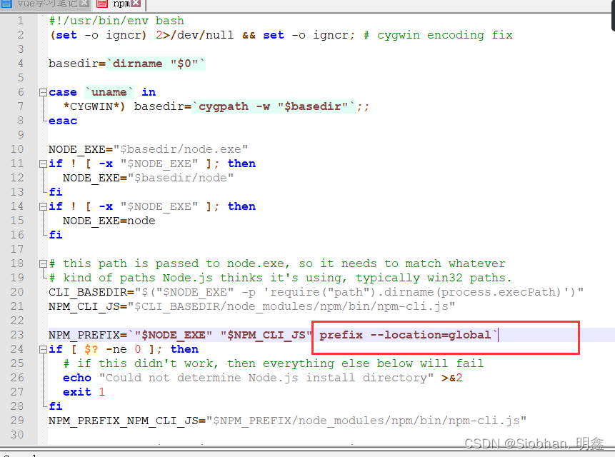 将npm文件的第23行,修改成下图样式,命令如下,可以直接粘贴