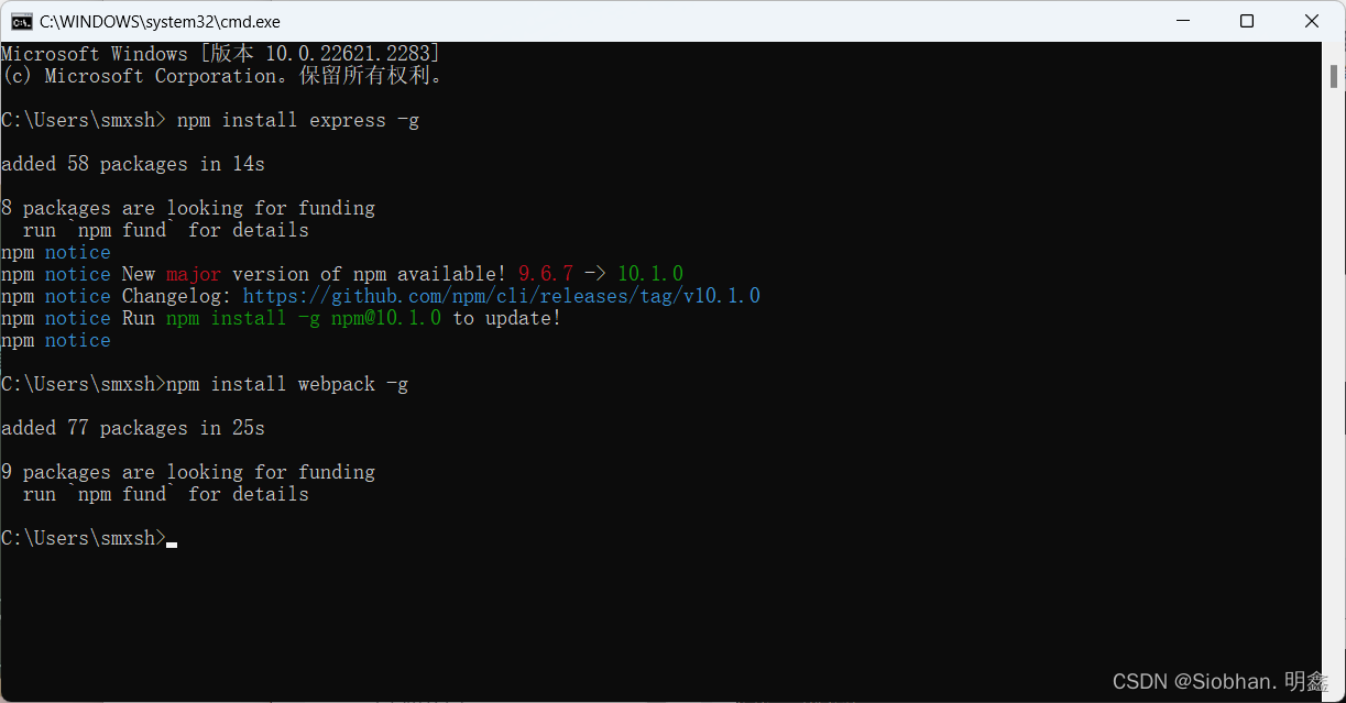咱们就安装最经常使用的express模块和webpack模块,打开cmd窗口,输入以下命令进行模块的全局安装: